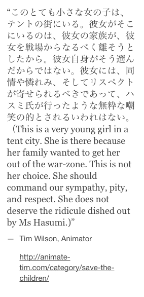 このとても小さな女の子は、テントの街にいる。彼女がそこにいるのは、彼女の家族が、彼女を戦場から離そうとしたから。彼女自身がそう選んだからではない。彼女には、同情や憐れみ、そしてリスペクトが寄せられるべきであって、ハスミ氏が行ったような無粋な嘲笑の的とされるいわれはない。