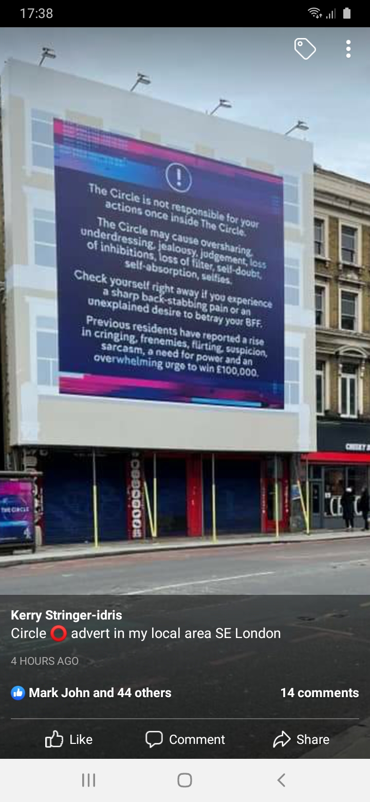 Having been on the show, I find the printed advert very uncomfortable reading and the TV trailer below is much the same content. Some “Previous residents” may have indeed “experienced an overwhelming urge to win £100,000”. I am pleased I was not one of them, however much I was asked what I would do with this prize or what I would do to get this prize. I was grateful and remain grateful to have won the viewers’ vote and I still do not fully understand how the prize money for the viewer’s vote was deducted from the prize money that was offered to the overall winner, but clearly the “circle of trust”, in the final reckoning, was played by the circle producers, rather suggesting that “the Circle” remains fully responsible for what goes on in its care whatever its advert may allege.