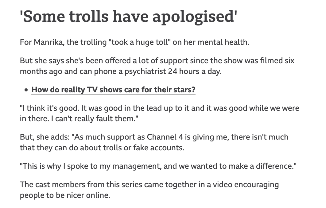 I am, therefore, delighted that Manrika’s experience is more positive than the one I witnessed and experienced, and, equally, I salute the efforts of the current cast to call for a kinder internet, but that is not enough in itself. We need to ensure that those who participate in these shows can leave them having had a fully positive experience, that they receive independent professional and responsible support that assists production and enables production to get on with the job it does best. The people who participate in these shows should have such a positive experience that they act as ambassadors for the show- instead, there is a host of people carefully measuring their language against their contractual obligations.