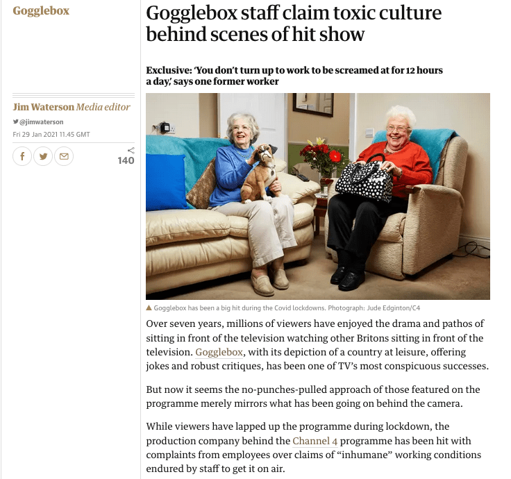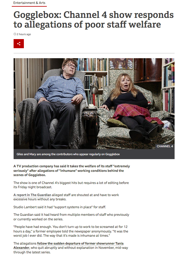 The BBC article offers little more to Jim waterson’s article than photographs and a bizarrely ambiguous statement about Tania Alexander who created Gogglebox and left suddenly in the middle of the 16th series of Gogglebox.